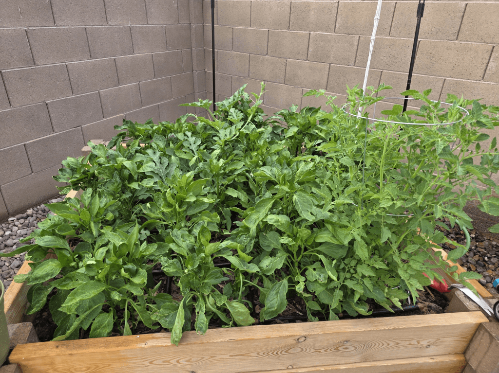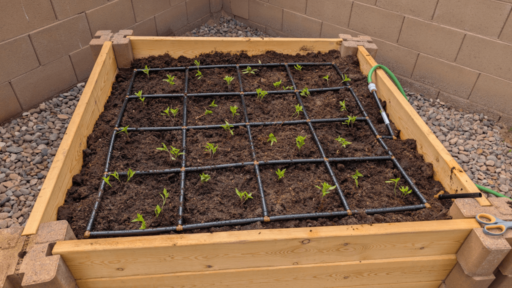 I landed on a very no-frills setup: 2×6 boards and some pre-made bricks from Lowe’s that the boards slot into. I didn’t have a big vision or a grand plan for layout, so I just picked a corner of the yard and built a single 4×4 raised bed.
