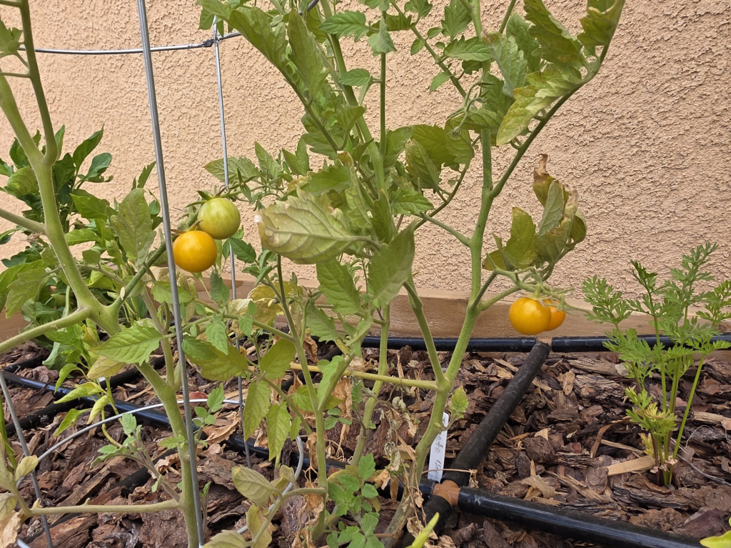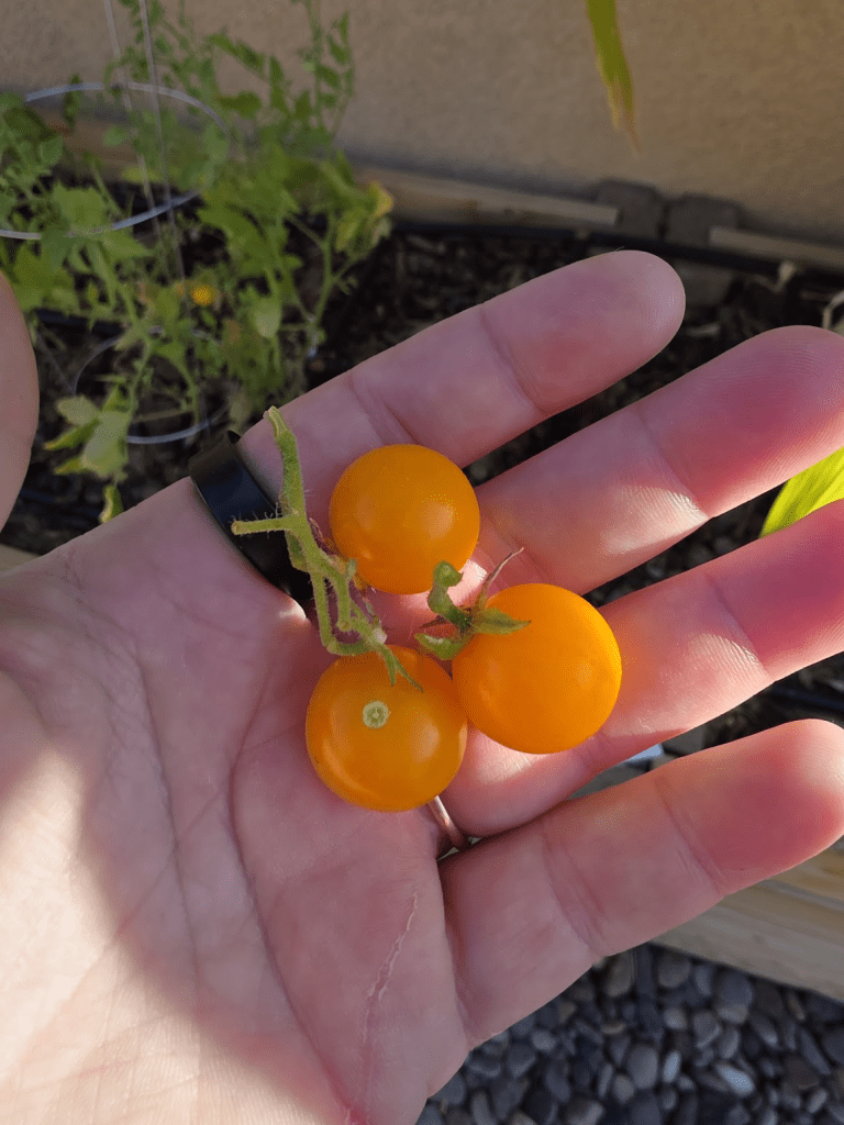 The tomatoes absolutely exploded. I planted two varieties of cherry tomatoes and ended up with more tomatoes than I knew what to do with. They grew huge, wild, and completely out of control. In retrospect, I wish I had planted something more useful for everyday cooking — like Roma tomatoes — but the cherry tomatoes were delicious.